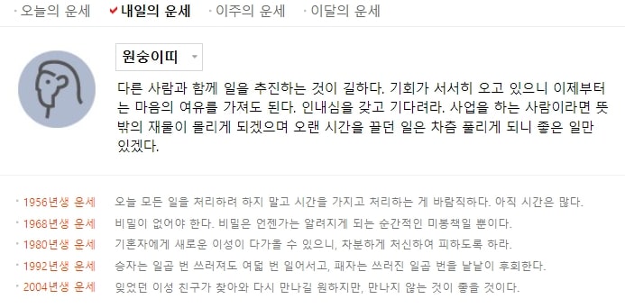 그런데 원숭이띠 한해의 운세는 나오지 않았다. 조금 아쉬움이 남는다. 삼재 너무 무섭다..