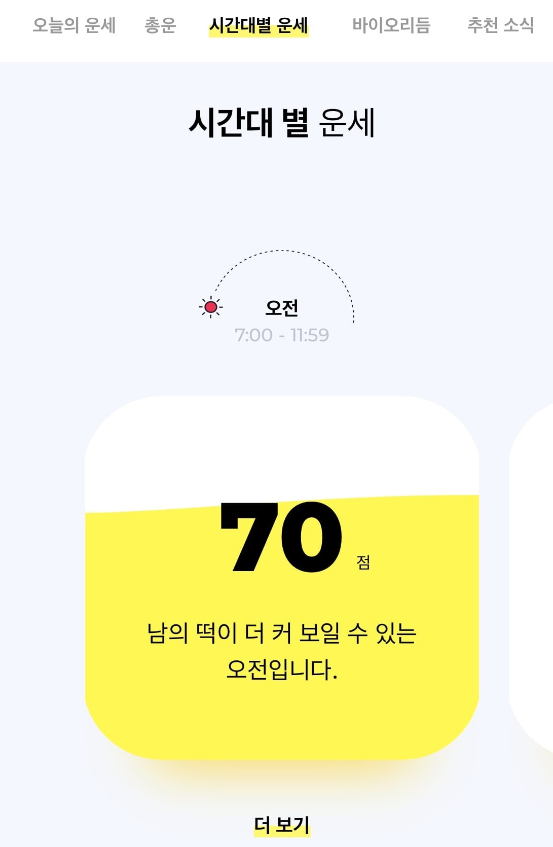 디테일을 보여주는 것 두 번째는 시간대별 운세인데 가끔 오늘 나의 운세가 별로인 듯싶을 때 들어가 보면 점수가 50점, 60점 이런다, 기가 막힌다. 거의 귀신 수준이다.